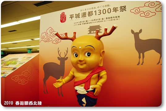 我們從難波搭阪急線到奈良,站內四處可見為遷都1300周年而特別設計的吉祥物--SENTOKUN(SENTO就是"遷都"的日文發音,KUN是君,卡內麻為了方便,另外給他起個名字叫「仙桃君」,有關仙桃君的事,下篇再另行說明)