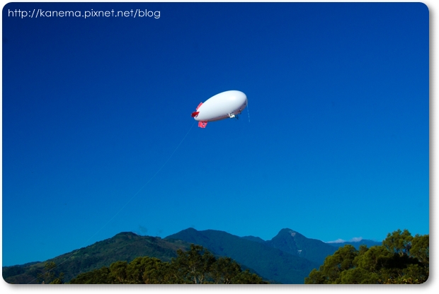 遠遠飄來一個真正有遨翔天空的熱氣球,上面有台東縣的圖文~